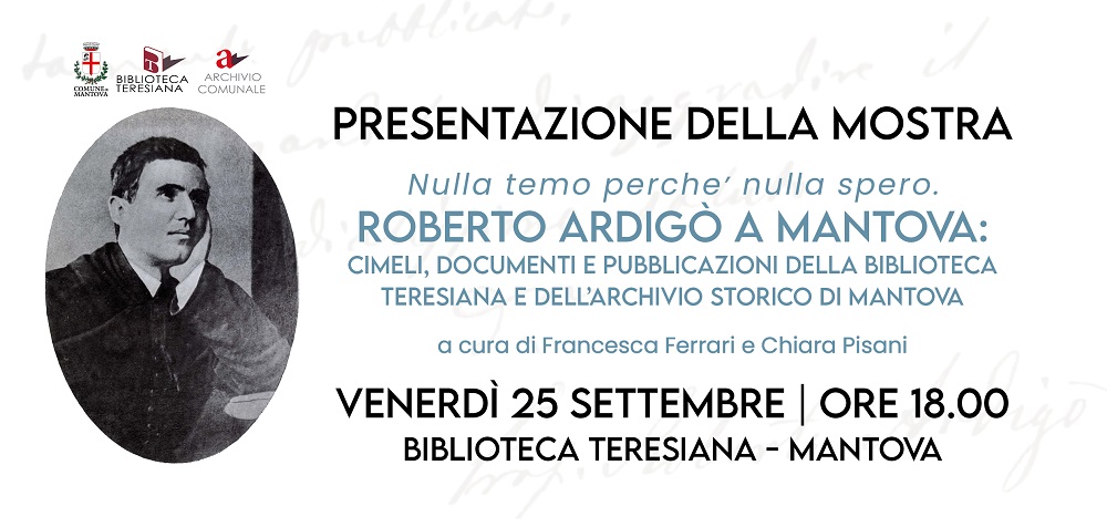 E' stata inaugurata venerdì 25 settembre la mostra "Nulla temo perchè nulla spero. Roberto Ardigò a Mantova" curata da Francesca Ferrari e Chiara Pisani. La Biblioteca Teresiana e l’Archivio storico Comunale di Mantova hanno la fortuna di conservare un importante nucleo di documenti legati alla figura dell’illustre filosofo positivista Roberto Ardigò (1828-1920). Si tratta soprattutto di documenti appartenenti al suo archivio personale, donato nel 1919 alla città di Mantova da Giovanni Marchesini, allievo del filosofo, come omaggio alla città adottiva del suo mentore.